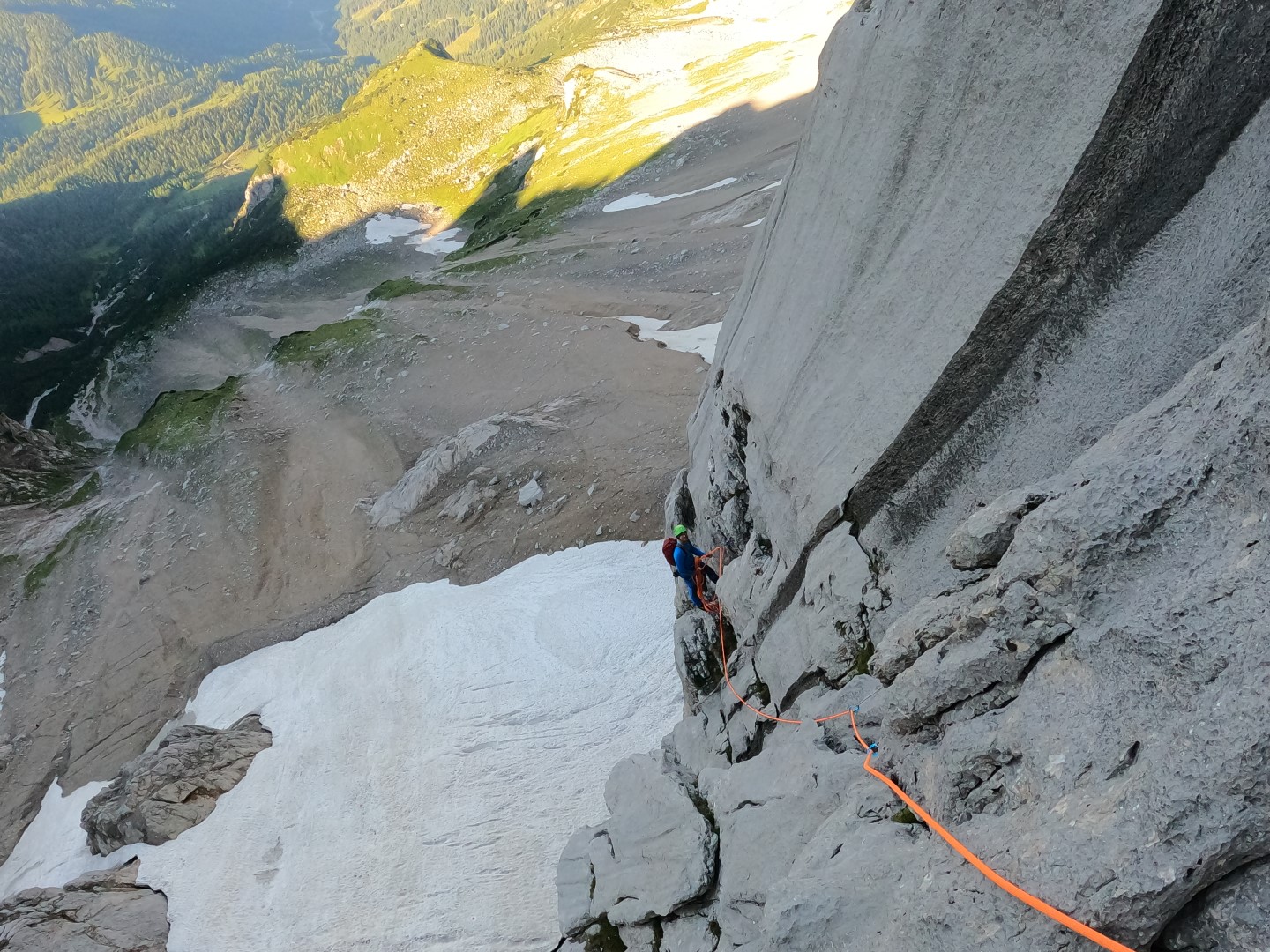Unser letztes Vorhaben war die Dachstein Südwand. Das Wetter war wie immer sehr wechselhaft und unsere Körper schon recht ausgelaugt von den vielen Aktiv-Tagen. Insofern war an eine 1000m Tour nicht zu denken, aber die Route "TOP SECRET" sollte das ideale Abschlussvorhaben sein. Die Tour ist recht brüchig und der Pichlkessel ist ein kleines Inferno, wo sehr viele lose Steine losgetreten werden können. Wir konnten gottseidank umsichtig mit den Füßen steigen, aber von anderen Seilschaften unter und ober uns, wurde viel losgetreten. Für die Laufende-Seil-Technik war uns die Tour dann leider doch zu schwer, so spulten wir brav die 40 bis 50m Seillängen runter. Die 4er und 5er sind meistens senkrechte Seillängen, aber ich wusste schon aus dem Pichlweg, dass man in der Südwand gerne mal einen Grad mehr dazurechnen kann. Die Tour ist am Vormittag wunderbar im Schatten und gerade in den letzten beiden Seillängen kam die Sonne. Da der Winter dieses Jahr viel Schnee hatte, ist vor allem im Pichlweg-Zustieg momentan noch sehr viel Schnee inklusive einer großen Randkluft.