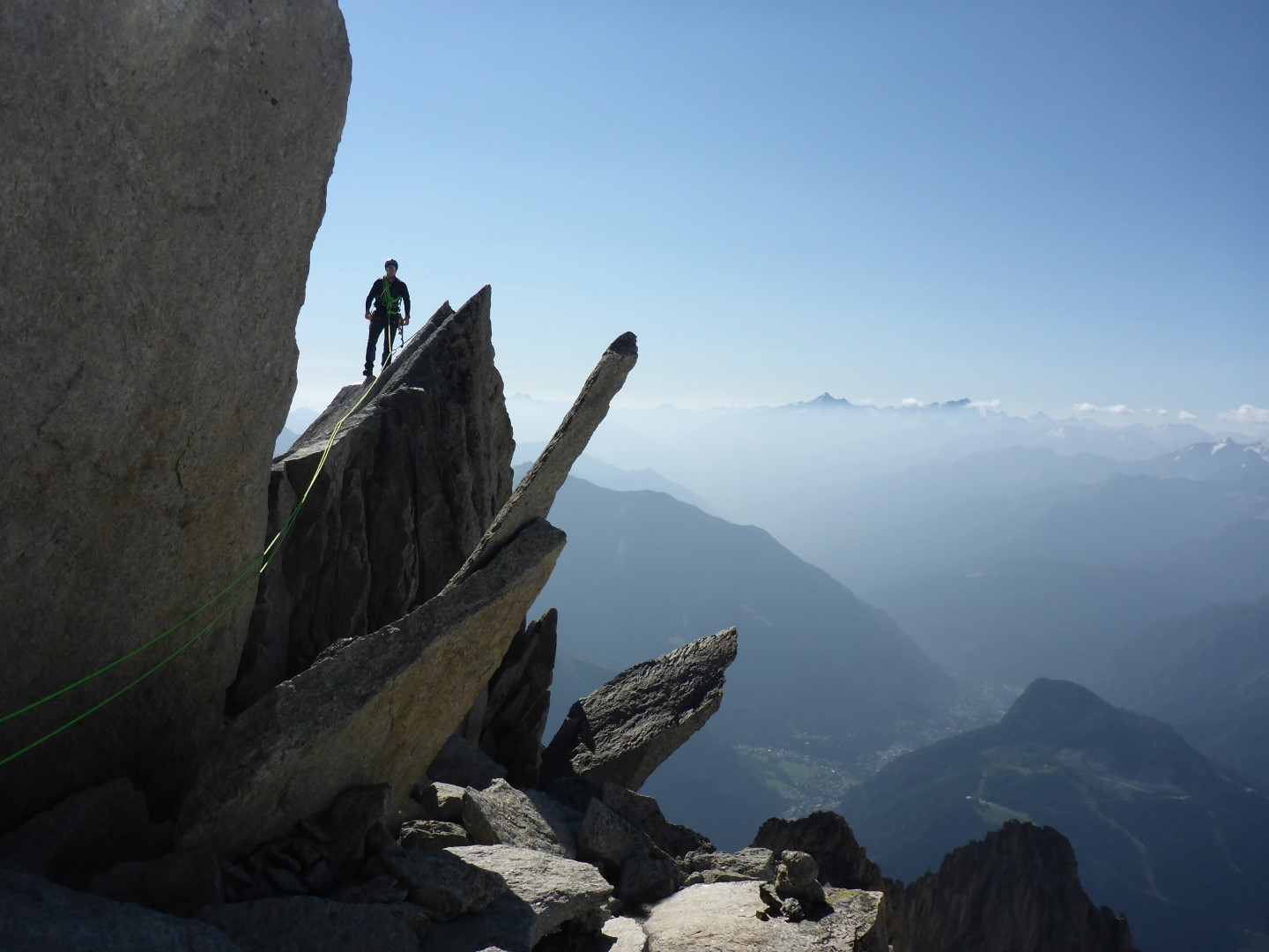 Unser eigentliches Ziel die Ronde Nordwand mussten wir verwerfen. Unsere Füße waren noch zu müde, außerdem konnten wir beim Zustieg zum Berg einen erheblichen Steinschlag in der Tour feststellen. Die Nordwand bietet sich wohl eher im Juni, Juli an, wenn es nicht so heiß ist. Die Dimensionen am Mont Blanc sind riesig. Wir bewegen uns hier fast nur in Anfänger und Einsteigertouren. Wer hier genug Kondi hat, kann locker mal 4 Tage in einem Grat klettern, bis er oben ist. Der Ronde Südostgrat (eine der leichten Touren am Mont Blanc) übertrifft locker den Stüdlgrat am Glockner an Schwierigkeit und Länge. Gut, das ist jetzt für uns auch nicht die große Schwierigkeit gewesen. Angefangen von Randkluften geht die Tour über in eine schöne Granitkletterei im 2,3 Grat. Die Wegfindung war nicht immer ganz eindeutig, dafür sind aber auch wenig Leute am Berg gewesen. Zum Schluss kommt noch einmal ein Wechtenkamm, den man bergauf auch ohne Steigeisen verantworten kann. Dann eine kurze Schlusskletterei und man steht bei der Gipfel-Madonna. Der Blick auf den unmittelbaren Mont Blanc ist wunderschön. Man steht auf einem 3.792m hohen Berg und schaut nochmal nach oben auf die 4.810m des Mont Blancs. Raufklettern auf den Ronde ist einfach, aber jetzt muss man wieder alles abklettern. Wir nahmen mit einer anderen Seilschaft den Schnellausstieg und mussten dreimal mit zwei 60er Seilen abseilen. Weiter unten im Gletscher gibt es eine riesige Randkluft bzw. Spalte, die wir einfach, aber actionreich überwinden konnte.